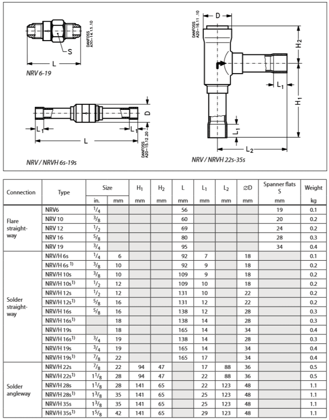 Обратные клапаны NRV Danfoss устанавливаются в жидкостных линиях, линиях всасывания и в трубопроводах горячего газа холодильных установок и систем кондиционирования воздуха, работающих на фторсодержащих хладагентах. Клапаны гарантируют движение потока хладагента только в заданном направлении и предотвращают обратную конденсацию хладагента (напр