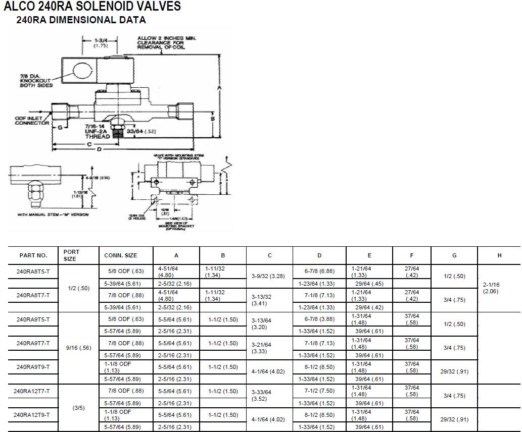Alco 240 RA 9 T5 - это 2-х ходовые соленоидные вентили не прямого действия, минимальный требуемый перепад давления для открытия 0,05 бар, используются для перекрытия потока на жидкостной, всасывающей или нагнетательной магистралях. Расшифровка маркировки 240 RA-модель серия, 9-диаметр седла (проходного сечения) кратный 16-м долям дюйма (