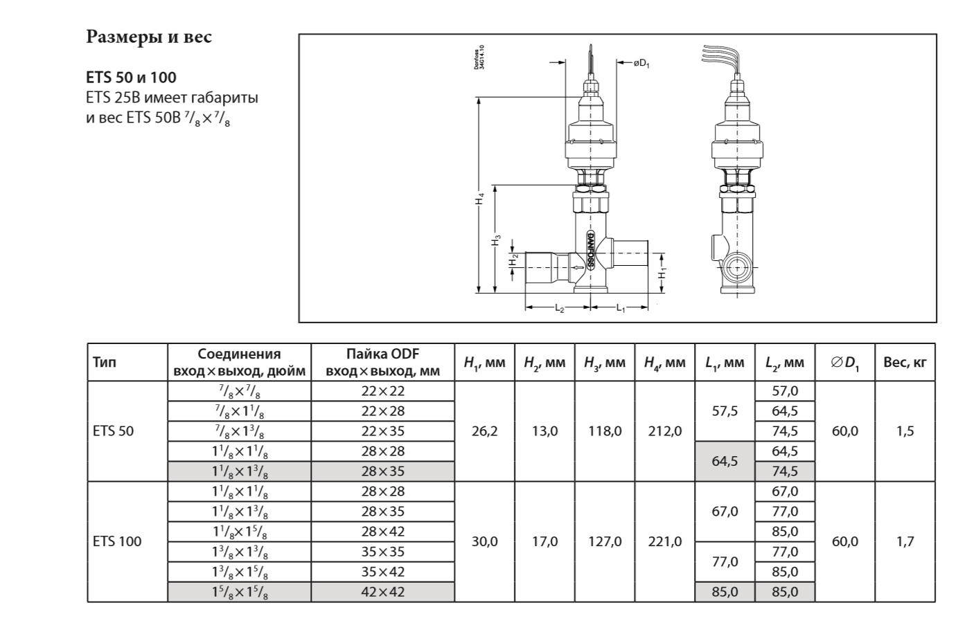 ETS 50 и ETS 100 оснащены смотровым стеклом с индикатором влажности.Корпус и AST двигатель из латуни, соединен в би-металл (нержавеющая сталь / медь).Совместимость: R410A, R407C, R404A/R507, R134a, R22.MOPD: 33 бар (449 фунтов на квадратный дюйм).Максимальное рабочее давление: 45.5 бар (660 фунтов на квадратный дюйм).Диапазо
