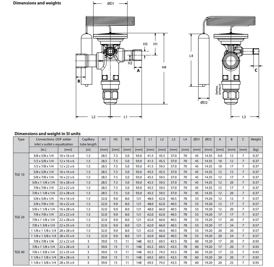 ТРВ Danfoss серии TGE - являются неразборными терморегулирующими вентилями, корпус выполнен из латуни, термобаллон из нержавеющей стали, клапанный узел не съемный. Существуют версии для работы на таких хладагентах: R410 буква L после аббревиатуры TGE, R404A/507A - буква S, R407C - буква Z, R134a - буква N, R22/R407C - буква X. Цифры после букв указ