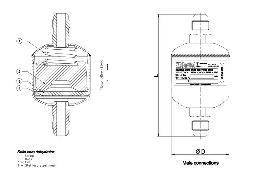 Герметичные Фильтры Castel типа 43 разработаны для использования в холодильных установках, работающих на всех общепринятых хлорфторсодержащих хладагентах, смешанных с полиэфирными маслами. Корпус фильтра и резьбовые соединения под вальцовку изготавливаются из стали. Также для заказа доступны фильтры с омедненными патрубками под пайку, позволяющими паять медную трубу либо внутри соединений(ODS), либо снаружи с помощью медной гильзы(ODM). По специальному заказу клиентов компания Castel также может предоставить фильтры типа 43 с медными паяными соединениями и резьбовыми соединениями стандарта SAE J 1453. Вставки в фильтрах типа 43 представляют собой молекулярное сито (100 %). Молекулярное сито предназначено для удаления воды из холодильной системы. Сердечник фильтра спроектирован таким образом, чтобы обеспечить максимальную поверхность контакта с хладагентом. Кроме того, внутренняя конструкция сердечника позволяет равномерно распределяться потоку хладагента внутри фильтра, что обеспечивает максимальную эффективность работы фильтра. По химической активности блок инертен, не растворяется, не вступает в реакции с хладагентами и способен фильтровать субпродукты масла, попавшие в контур. Грязь скапливается в зазоре между корпусом фильтра и сердечником, это предотвращает засор фильтра. Технические характеристики герметичных фильтров CASTEL: Корпус- сталь; Присоединения - пайка/вальцовка;Температурный диапазон от -40 до +80°C; Рабочее давление - 45 бар.