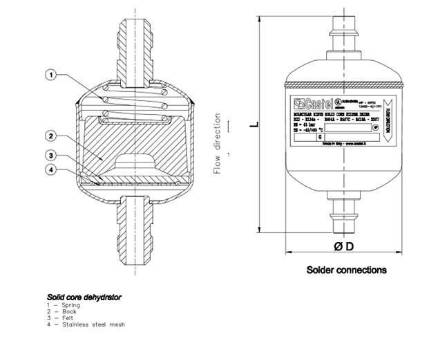 Герметичные Фильтры Castel типа 43 разработаны для использования в холодильных установках, работающих на всех общепринятых хлорфторсодержащих хладагентах, смешанных с полиэфирными маслами. Корпус фильтра и резьбовые соединения под вальцовку изготавливаются из стали. Также для заказа доступны фильтры с омедненными патрубками под пайку, позволяющими паять медную трубу либо внутри соединений(ODS), либо снаружи с помощью медной гильзы(ODM). По специальному заказу клиентов компания Castel также может предоставить фильтры типа 43 с медными паяными соединениями и резьбовыми соединениями стандарта SAE J 1453. Вставки в фильтрах типа 43 представляют собой молекулярное сито (100 %). Молекулярное сито предназначено для удаления воды из холодильной системы. Сердечник фильтра спроектирован таким образом, чтобы обеспечить максимальную поверхность контакта с хладагентом. Кроме того, внутренняя конструкция сердечника позволяет равномерно распределяться потоку хладагента внутри фильтра, что обеспечивает максимальную эффективность работы фильтра. По химической активности блок инертен, не растворяется, не вступает в реакции с хладагентами и способен фильтровать субпродукты масла, попавшие в контур. Грязь скапливается в зазоре между корпусом фильтра и сердечником, это предотвращает засор фильтра. Технические характеристики герметичных фильтров CASTEL: Корпус- сталь; Присоединения - пайка/вальцовка;Температурный диапазон от -40 до +80°C; Рабочее давление - 45 бар.
