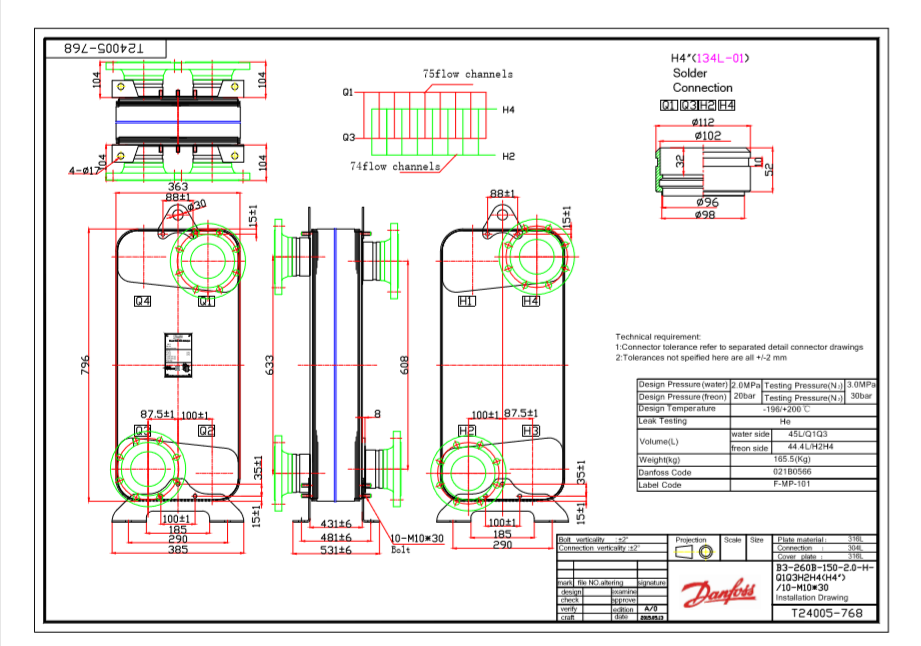 Теплообменник B3-260B-164-2,0-H типа BPHE состоит из рифленых тонкостенных теплообменных пластин из нержавеющей стали изготовленных на основе микроканальной технологии. Создан с помощью рентабельной, хорошо зарекомендовавшей технологий, которая обеспечивает эффективный теплообмен и позволяет сократить используемое пространство, количество хладагент